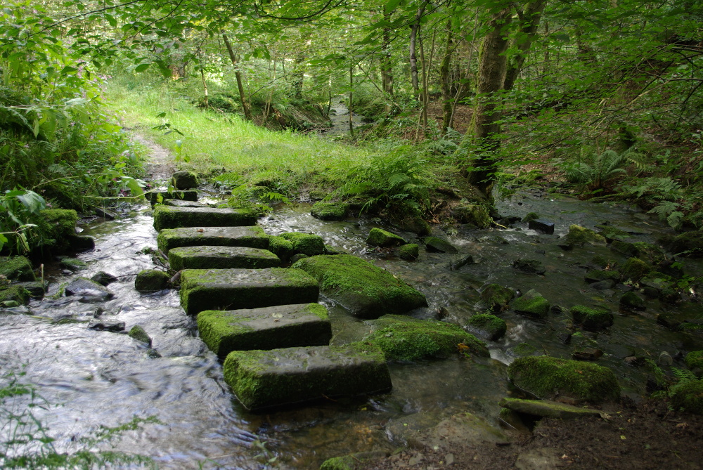 ‘Stepping stones – note the contrast of the striking green colour of the grass, with the beck disappearing upstream into the far distance.’