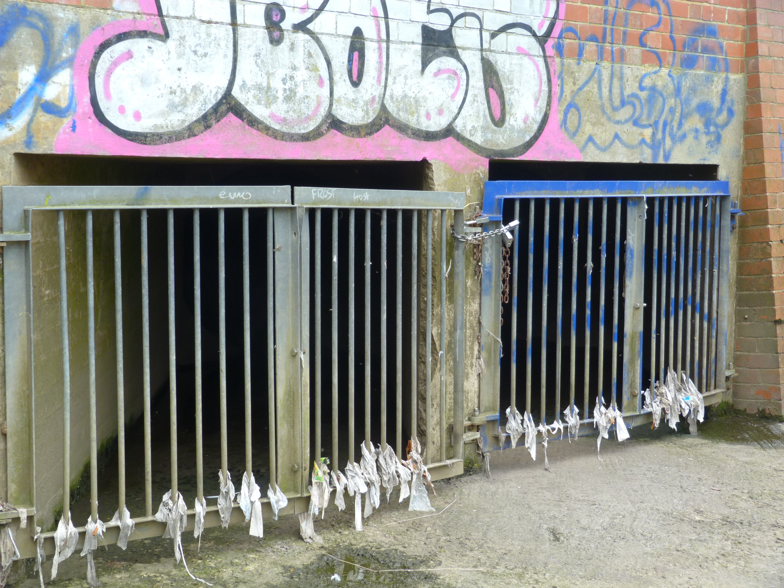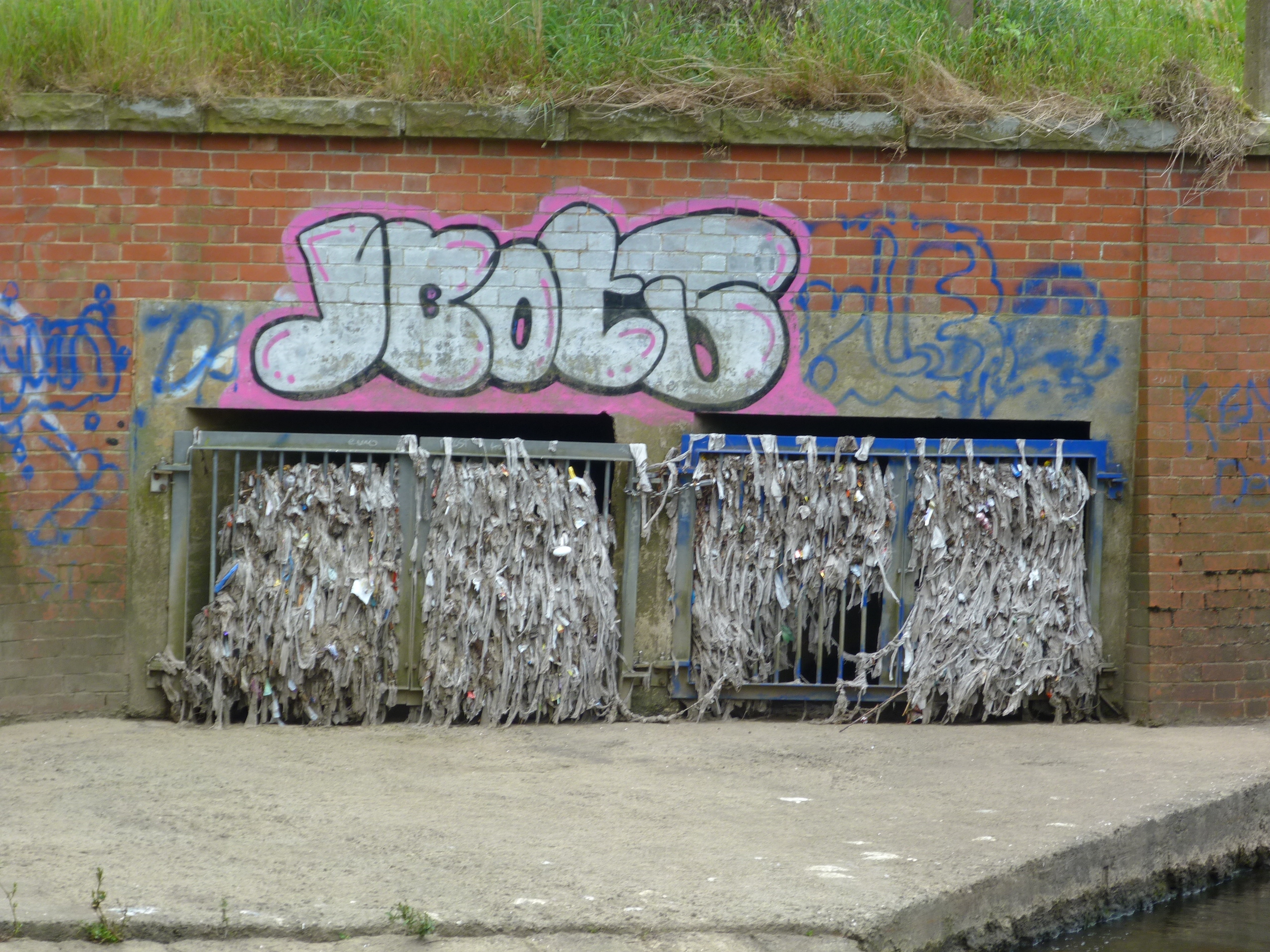 The photo is of a typical CSO outlet just upstream from Apperley Bridge. The grille has caught plastic layers from sanitary towels: a small sample of what the sewers have to manage. Thumbs up to Yorkshire water for clearing the debris but here is the same CSO gate a few weeks later: