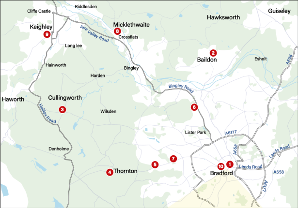 The map shows the starting point of 10 different walks to see the becks in and around Bradford.